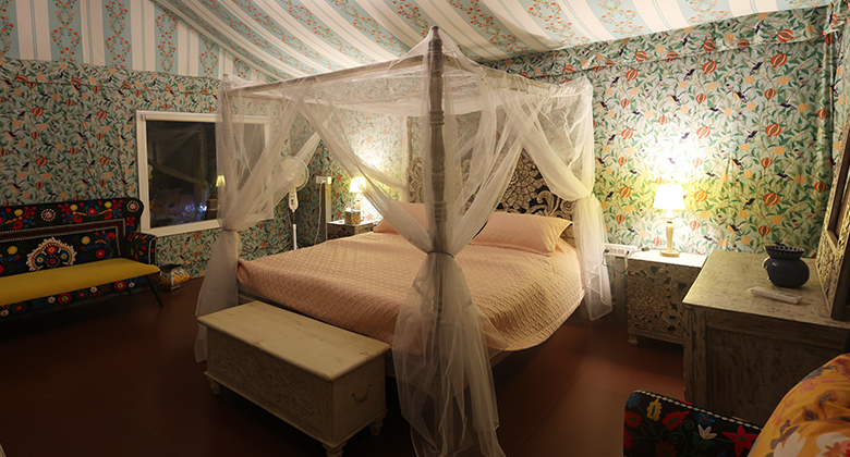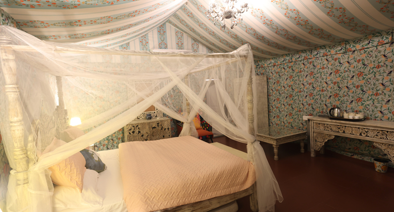 Step into a space that feels like a soft exhale. At its center stands a grand four-poster bed draped in gauzy fabrics, set beneath a delicate chandelier that casts a warm, golden glow as dusk falls. The tent walls are adorned with sky-blue motifs that dance playfully across the canvas, while the peach-hued bed linens and cushions add a gentle blush of warmth and grace to the room. The color palette is thoughtfully chosen to be soothing yet uplifting—every detail designed to calm the senses.
